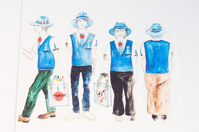 東京の制服は白地のポロシャツ。青いベストとストライプのネクタイを着用しているように見えるが、実際はプリント。帽子の水玉のリボンは、日の丸のイメージ。ポロシャツは1600枚、帽子とカバンは50個用意したという。