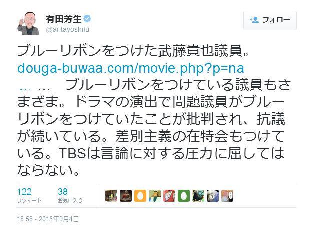 ブルーリボンをつけた武藤貴也議員。ブルーリボンをつけている議員もさまざま。ドラマの演出で問題議員がブルーリボンをつけていたことが批判され、抗議が続いている。差別主義の在特会もつけている。TBSは言論に対する圧力に屈してはならない。