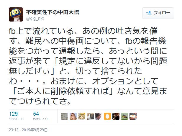 fb上で流れている、あの例の吐き気を催す、難民への中傷画について、fbの報告機能をつかって通報したら、あっという間に返事が来て「規定に違反してないから問題無しだぜぃ」と、切って捨てられたわ・・・。おまけに、オプションとして「ご本人に削除依頼すれば」なんて意見までつけられてさ。