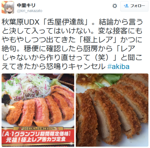 秋葉原の飲食店「独眼一刀流舌屋 伊達哉」で「極上レア舌カツ定食」を注文したところ、レアというメニュー名にもかかわらず、しっかりと火が通ったレアじゃない牛タンが出てきたらしい。