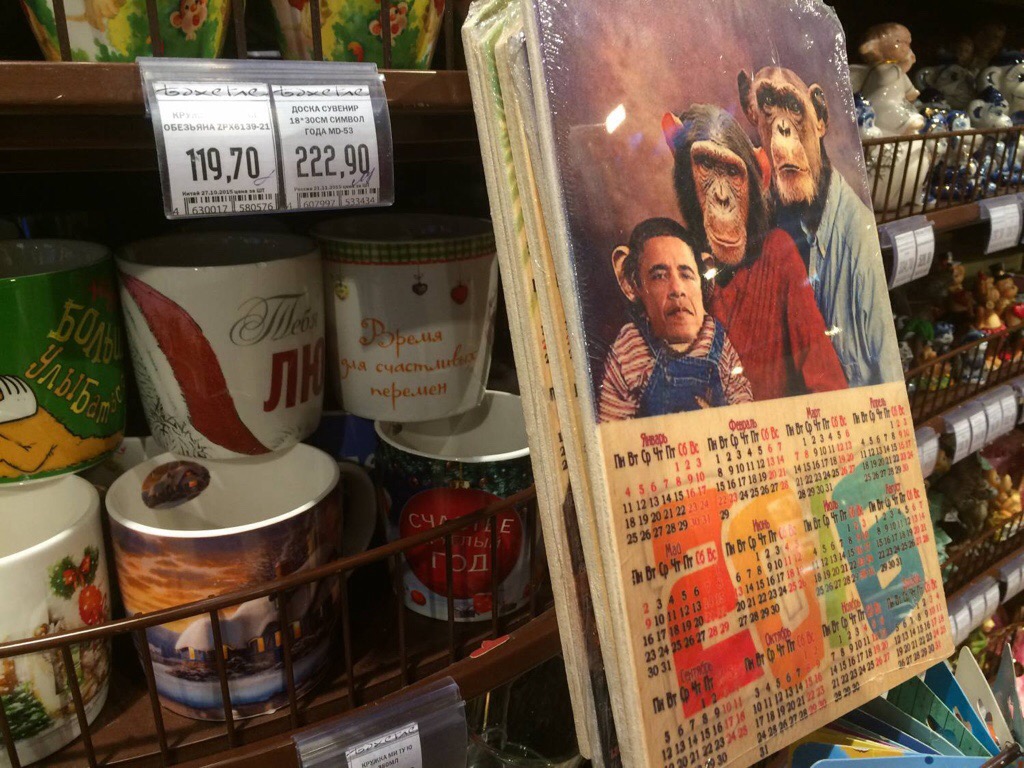 問題のまな板は2016年のカレンダーをデザインしたもので、来年の干支(えと)にちなんでサルの家族が描かれている。そのうち最も小さいサルの顔の部分に、オバマ大統領の顔写真が合成されていた。