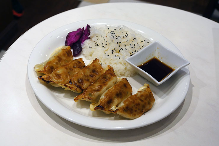 餃子ライスの内容は、餃子6個、ライス小盛り、漬物という構成。それに餃子のタレがついてくる。餃子とライスだけのシンプルな組み合わせに思えるが、これが1050円するのである。