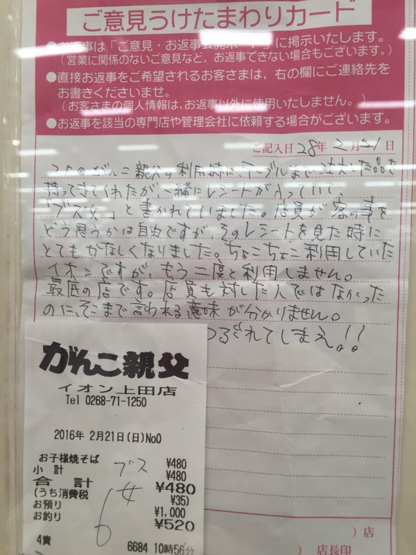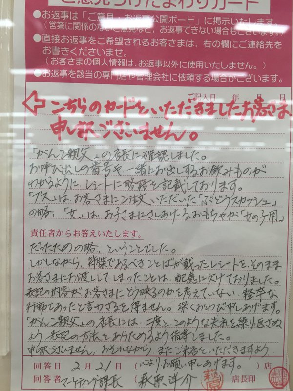 女性客はこれに対して「店員が客のことをどう思うかは自由ですが、そのレシートを見たときにとてもかなしくなりました」と投書している。これはお店に張り出されるもので誰でも閲覧出来る。