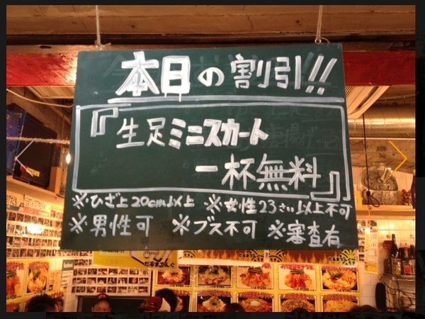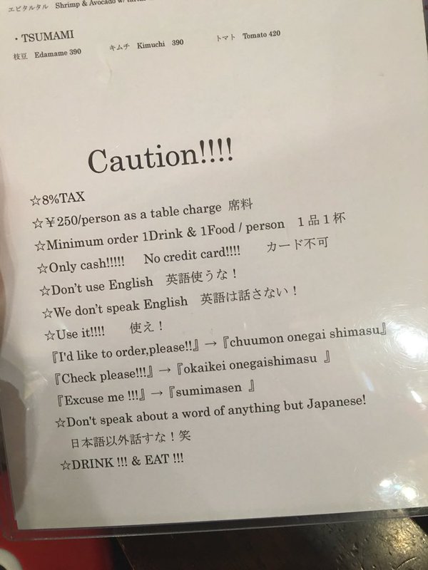 二軒目(店名秘密)隣の席の外国人観光客がメニューを見て怒って帰った。なにかと思ってメニューを取ったらこれ。日本人の私でも気分悪い。