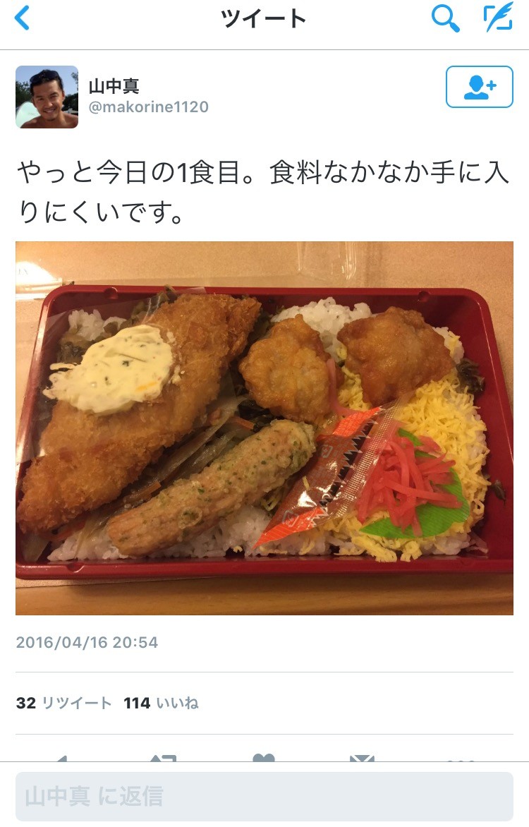 食料手に入りにくいと弁当の画像付きで呟く→翌日ホテル戻るのに6時間かかってつれーわラーメン屋で食うわー