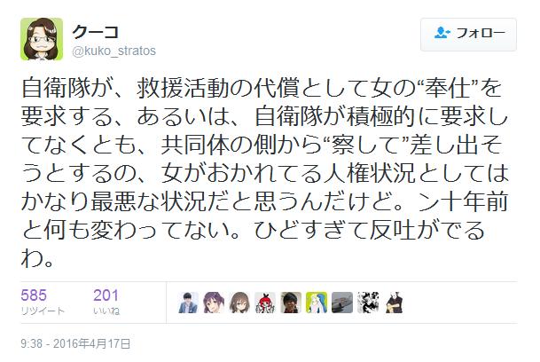 自衛隊が、救援活動の代償として女の“奉仕”を要求する、あるいは、自衛隊が積極的に要求してなくとも、共同体の側から“察して”差し出そうとするの、女がおかれてる人権状況としてはかなり最悪な状況だと思うんだけど。ン十年前と何も変わってない。ひどすぎて反吐がでるわ。