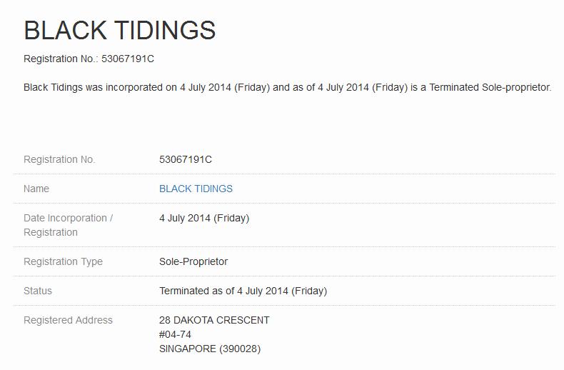 Black Tidings was incorporated on 4 July 2014 (Friday) and as of 4 July 2014 (Friday) is a Terminated Sole-proprietor.