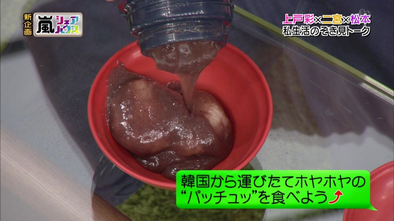 松本さんが水筒からおわんにパッチュッを移すと、もちがゴロッと落ちてきた。上戸さんは「わ~うれしい~」と終始テンションが高かったが、松本さんはもちが落ちるたびに「うわっ。何これ」「うわうわうわ」と半笑いで言い、二宮さんに「反応が『おぉ~』とかじゃなくて『うわっ!』て言ったもんね」と突っ込まれていた。