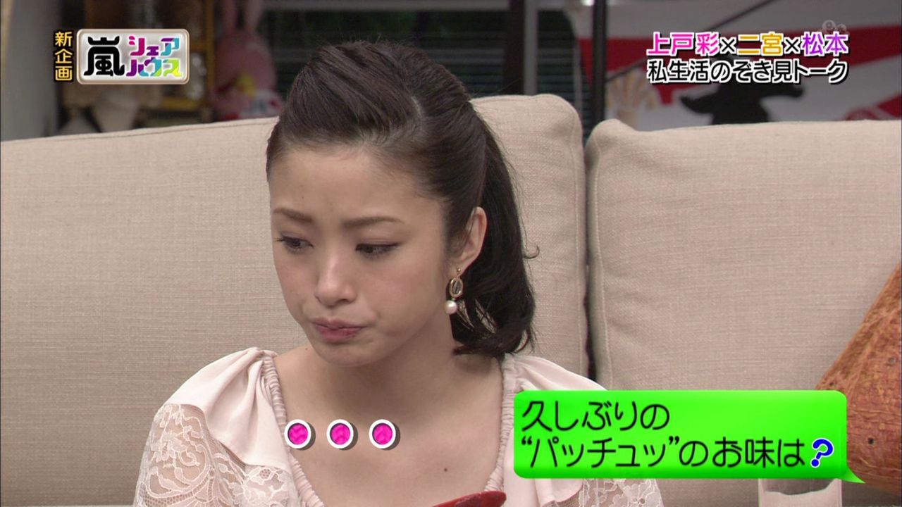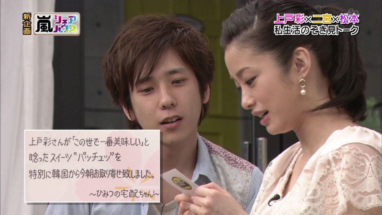 2012年4月26日放送の「ひみつの嵐ちゃん!」(TBS系)のゲストに上戸さんが登場した。二宮さん、松本さんと部屋でくつろぎながらトークや料理を楽しむという企画の中で、番組のディレクターから「FROM KOREA」と書いた段ボールの荷物が届けられた。