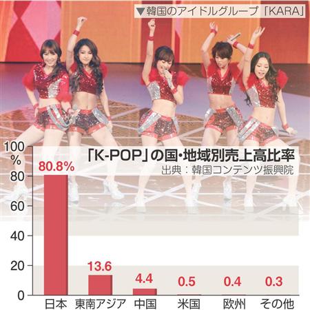 その一方で、特定市場、特に日本への高い依存度や収益構造の問題点も指摘されている。欧米でもライブを行うなどいまや韓流の主流となっているK-POPだが、韓国コンテンツ振興院の調べでは、アジアでの売り上げが全体の99%を占め、なかでも日本が80.8%と突出する。