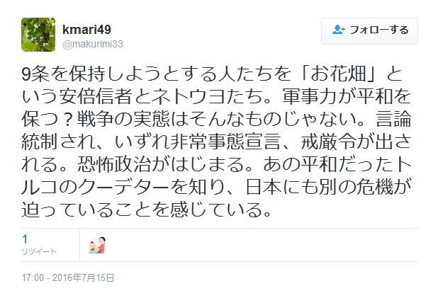 9条を保持しようとする人たちを「お花畑」という安倍信者とネトウヨたち。軍事力が平和を保つ?戦争の実態はそんなものじゃない。言論統制され、いずれ非常事態宣言、戒厳令が出される。恐怖政治がはじまる。あの平和だったトルコのクーデターを知り、日本にも別の危機が迫っていることを感じている。