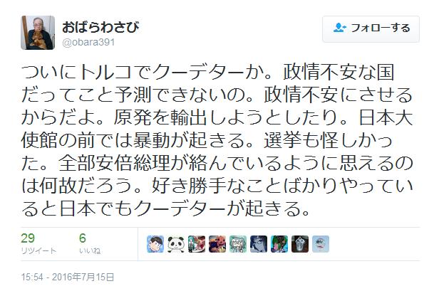 ついにトルコでクーデターか。政情不安な国だってこと予測できないの。政情不安にさせるからだよ。原発を輸出しようとしたり。日本大使館の前では暴動が起きる。選挙も怪しかった。全部安倍総理が絡んでいるように思えるのは何故だろう。好き勝手なことばかりやっていると日本でもクーデターが起きる。