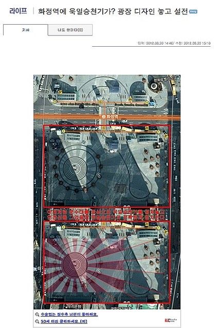 ・竹島問題や慰安婦問題などをめぐり「反日」への動きが高まる韓国で、ついにこんなものにまで“親日”疑惑が浮上した。同国京畿道・高陽市の花井(ファジョン)駅の駅前広場のデザインが、上空から見るとまるで「旭日旗」のようなのだという。広場は噴水を中心に、放射線に広がる模様が入っているのだが、それが太陽の光が放射線状に伸びる旭日旗と酷似しているのだそうだ。