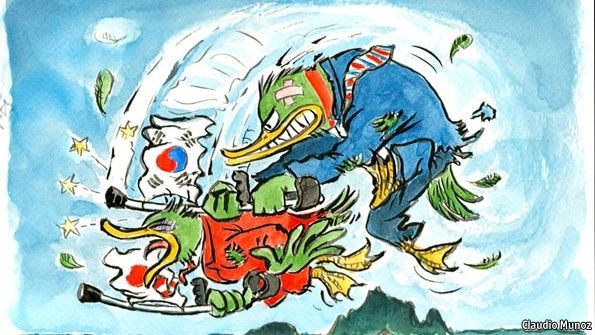一方、エコノミスト・オンライン版は8日、太極旗を持った鴨(かも)が日章旗を持った鴨を殴る挿絵とともに、「レイムダックと飛ぶ羽毛」と題した記事を掲載。「韓国の歴代大統領は、執権中の後半まで日本に友好的歩みを見せるが、任期末に突然敵対的に背を向ける」と解説した。