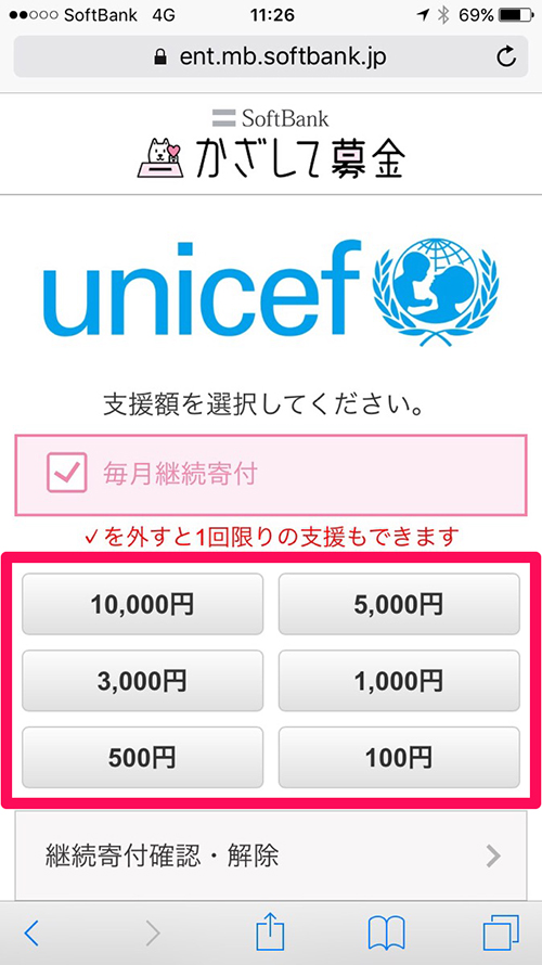 編集部でも「かざして募金」の「日本ユニセフ」のページを開いて検証してみたところ、トップ画面から「ケータイ料金と一緒に募金する(SoftBank)」→「金額を選択(100円~1万円)」→「はい」と最短3回タップするだけで募金が完了することを確認しました。なお、金額選択画面ではデフォルトで「毎月継続寄付」にチェックが入っており、手動でチェックを外さないと自動で毎月継続寄付になってしまう仕組み。またパスワード入力などの本人認証も求められませんでした。