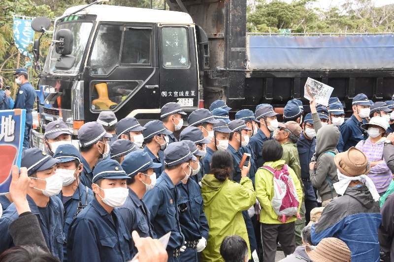 一方、沖縄防衛局は抗議の市民が120人ほどに減った午後0時半以降、ダンプによる砂利輸送を開始。機動隊約130人が市民を強制排除して道路脇に封じ込め、ピストン輸送を繰り返した。