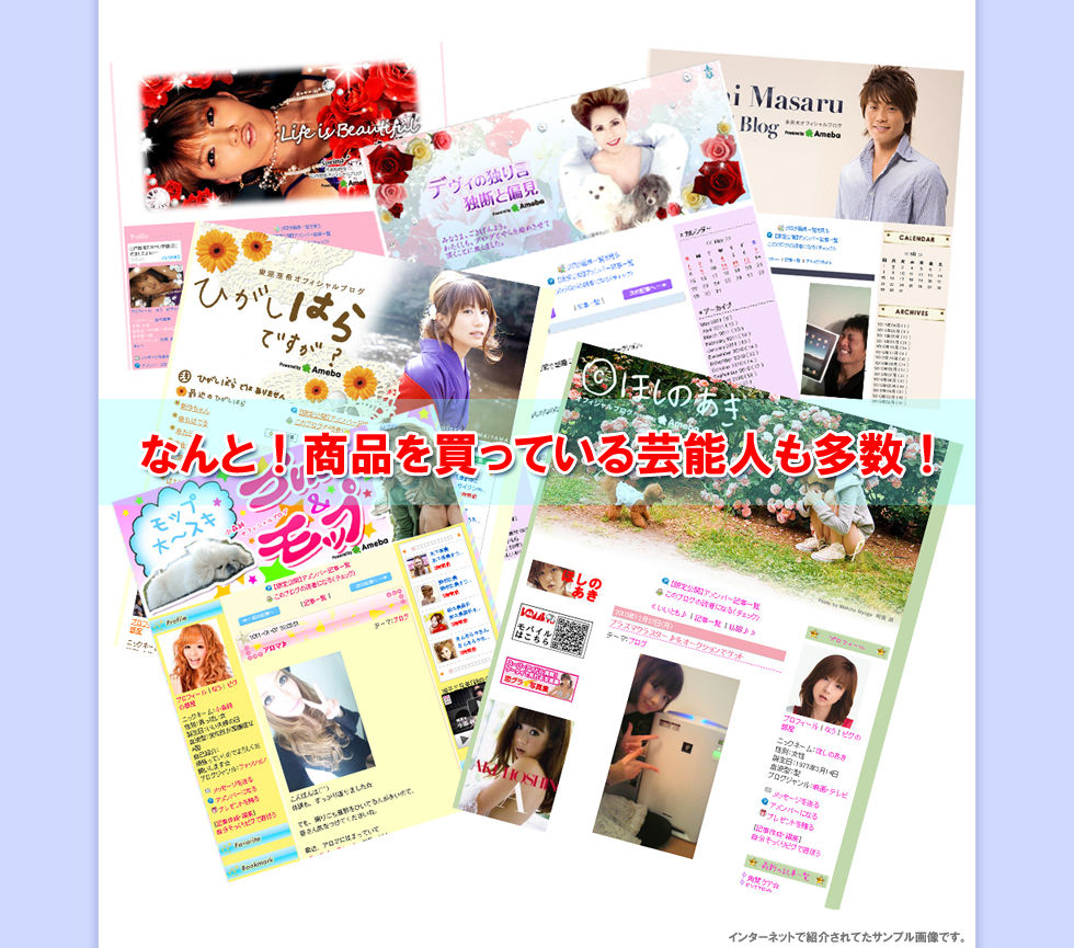 ほしのあき、熊田曜子、永井大、小森純、松金よう子、デヴィ夫人、東原亜希らがブログで宣伝を行った芸能人として該当