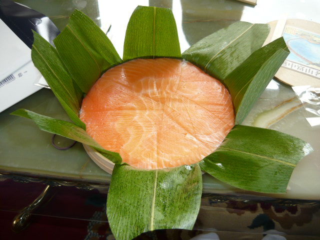 ます寿司は、笹の葉を向かずに、まず寿司全体を逆さにしてフタの上に出し、