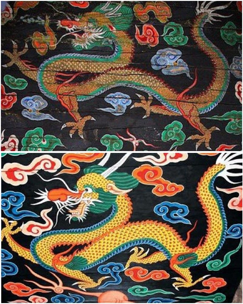 竜の絵は朝鮮時代初期の様式に倣い、荘厳で落ち着いた印象の黄や緑の顔料が使われている。現在の復元工程率は95%。来年1月末に仮設フェンスを解体され、威厳のある姿を現す。
