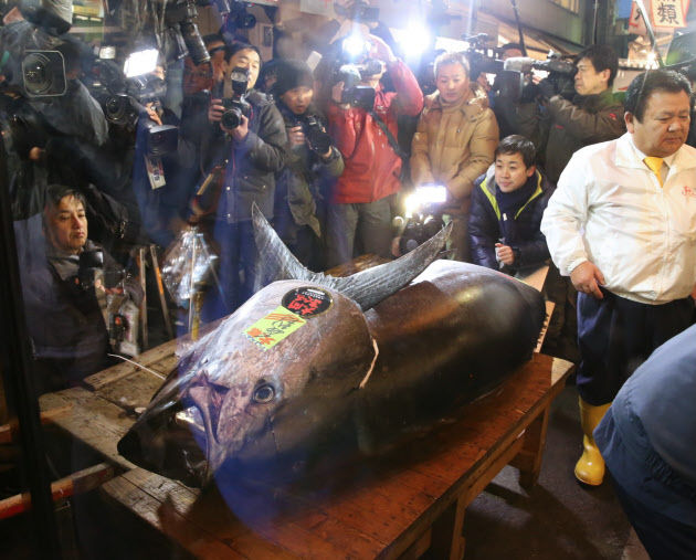 新春恒例の初セリが5日、東京・築地市場で開かれ、青森・大間産のクロマグロが1キロあたり70万円、1匹1億5540万円の史上最高値で競り落とされた。これまでの最高値は昨年の5649万円(キロ21万円)。落札者は昨年に続き、すし専門店「すしざんまい」を展開する喜代村(東京・中央)