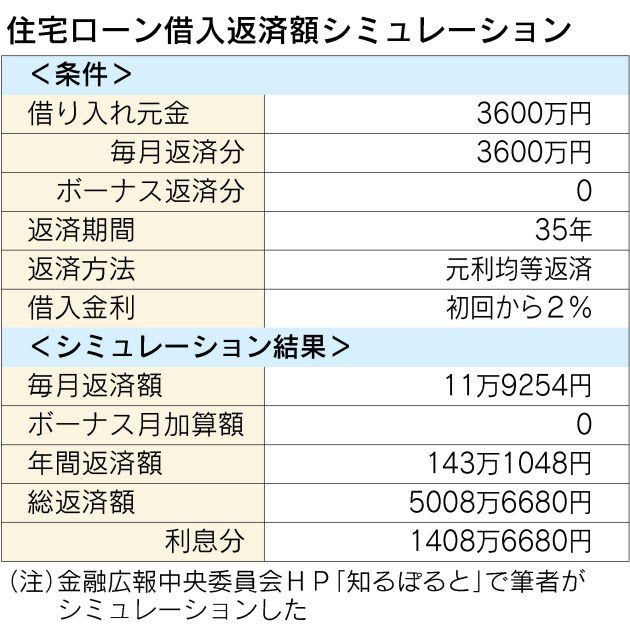 マイホーム購入費用は一生で一番大きな買い物と言われています。土地付き注文住宅の全国平均は約3607万円(首都圏の場合は約4396万円)、マンションの場合は全国平均で約3840万円(首都圏の場合は約4211万円)です(フラット35利用者調査報告・平成23年版)。その他の購入時の費用として、諸費用(税金、ローン関係費用、各種手数料など)が物件価格の5~10%かかります。住宅ローンを組むなら金利の支払いもあります。3600万円のローンを組み、金利2%で35年返済をする場合、利息支払いは約1409万円になります。