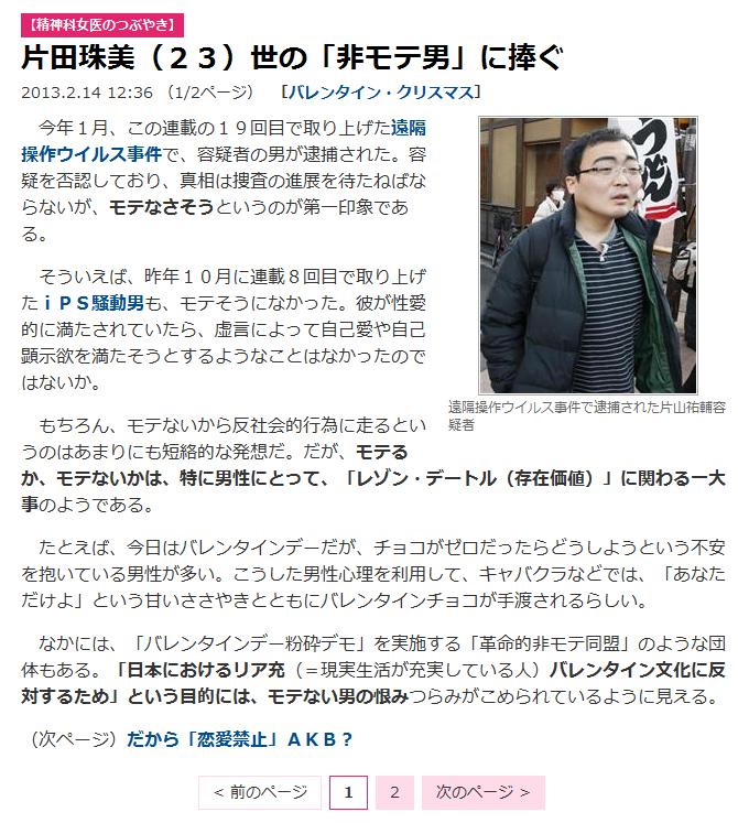 大手新聞社である産経新聞が“片田珠美(23)世の「非モテ男」に捧ぐ”という記事にて、少し目を疑うような記事を公開されている。