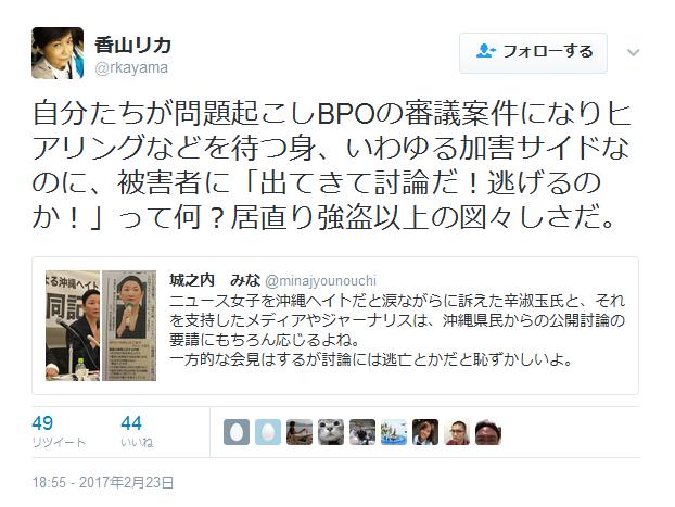 ニュース女子を沖縄ヘイトだと涙ながらに訴えた辛淑玉氏と、それを支持したメディアやジャーナリスは、沖縄県民からの公開討論の要請にもちろん応じるよね。一方的な会見はするが討論には逃亡とかだと恥ずかしいよ。