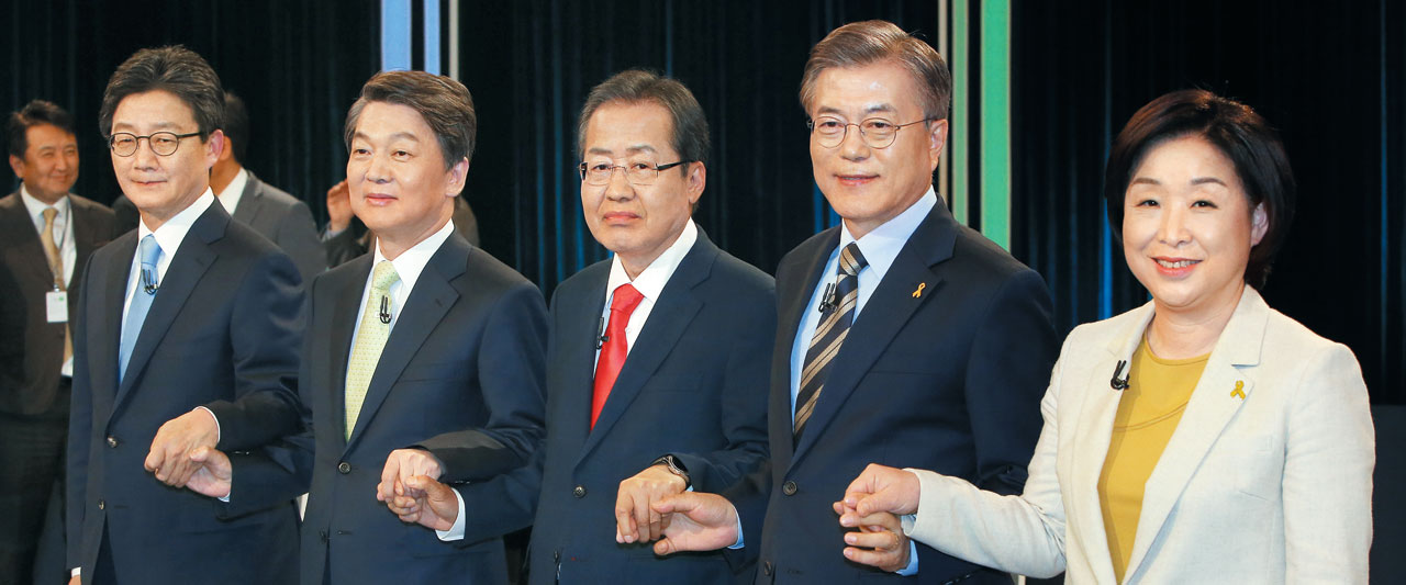 中央選挙管理委員会主催第19代韓国大統領選挙公式テレビ討論会が23日、ソウル汝矣島のKBS放送本社で午後8時から2時間にわたり行われた。テレビ局ではなく中央選挙管理委員会が主催する公式討論会は3回行われるが、その最初のテーマは「外交・安保・政治」だった。ところが北朝鮮の核問題など国の命運が懸かった問題での論争は行われず、感情的な衝突と「ネガティブキャンペーン」ばかりが目立った。