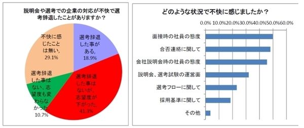 アンケートによると、採用時の説明会や選考において企業の対応を「不快に感じたことがある」と答えた学生は全体の68.7%に上っている。「不快に感じたことがある」と答えた学生のうち、それを理由に「選考辞退したことがある」と答えた人は18.9%、「選考辞退したことはないが、志望度が下がった」と答えた人は41.3%だった。どんなことを不快に感じたのか、多かったものから順にフリー回答を紹介する。
