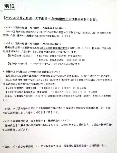 ホール営業所に設置されている「パチスロ織田信長の野望-天下創世-」におきましては、本通知をご確認頂いた後、速やかに稼働を停止頂きます様お願い申し上げます。