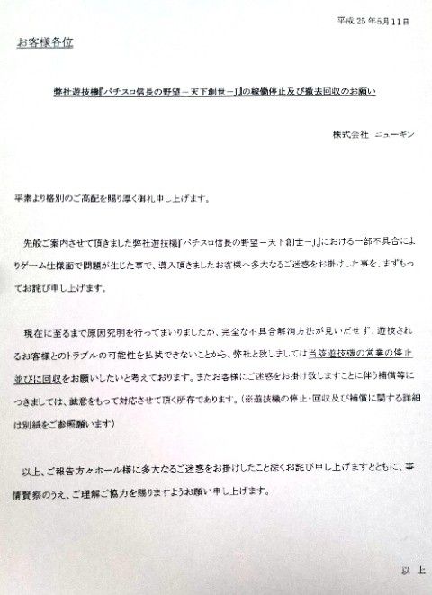 現在に至るまで原因究明を行ってまいりましたが、完全な不具合解消方法が見いだせず、遊戯されるお客様とのトラブルの可能性を払拭できないことから、弊社と致しましては当該遊技機の営業の停止並びに回収をお願いしたいと考えております。またお客様に御迷惑をお掛け致しますことにともなる補償等につきましては、誠意をもって対応させて頂く所存であります。(遊技機の停止・回収及び補償に関する詳細は別紙をご参照願います。)
