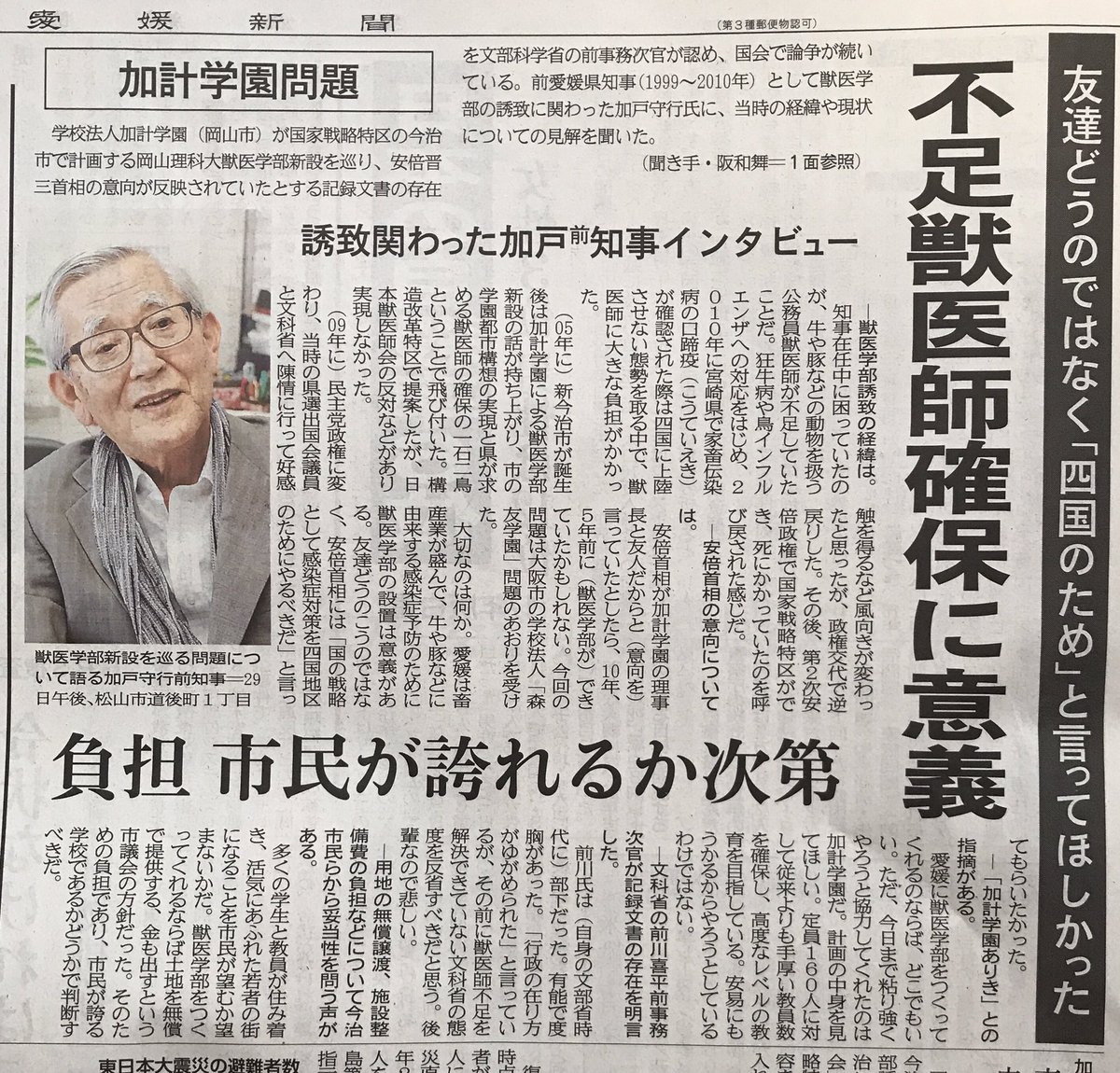 (1)もともと愛媛県では獣医師不足が深刻化しており、狂牛病や鳥インフルエンザ、口蹄疫の対策が課題だった。知事としては頭を悩ませる問題だ。