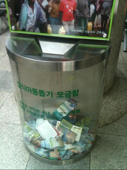 韓国のネットサイト『ilbe.com』に公開されたとあるが話題になっている。それは韓国の街中に設置された募金箱。その中身がゴミしか入っていないのである。いや、近くでよーく見るとウォン札が底の方に入っているようだ。しかしゴミに紛れてしまっている。遠目から見たらゴミ箱に見えてしまうが、中を見せるように透けさせているのは募金箱の特徴である。箱にも「募金入れ(???)」と書かれている。