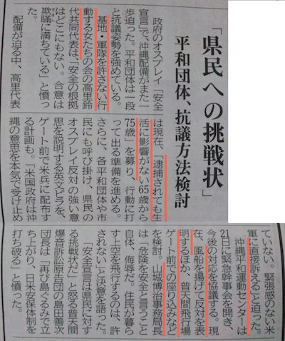 逮捕容疑は20日午前9時15分ごろ、移設先に隣接する米軍キャンプ・シュワブゲート近くの国道329号で、資材を運んでいたダンプカーの前に立ちふさがり、通行を妨害した疑い。