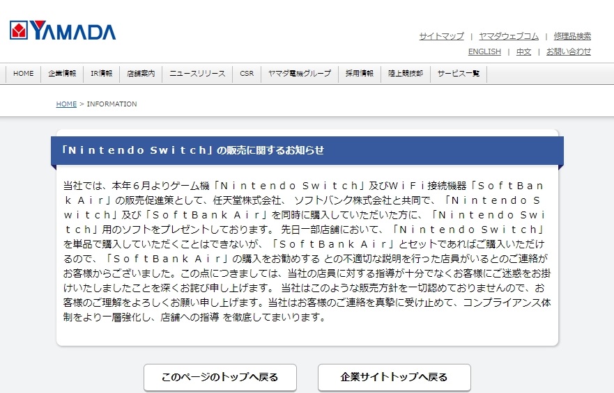 ヤマダ電機は、Twitter上で「Nintendo Switchを購入しようとしたら“単品販売はできないがネット開設を申し込めば購入権が得られる”と言われた」とするツイートが投稿され「抱き合わせ商法で独占禁止法違反ではないか」とする指摘が相次いでいた件について、抱き合わせ販売を否定するとともに謝罪文を発表した。