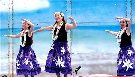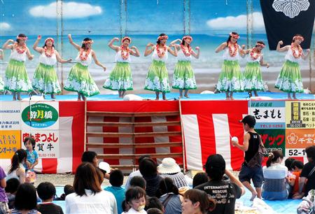 対馬厳原港まつりの初日は地元フラダンスチームによるショーが華を添えた=3日、長崎県対馬市(田中一世撮影)
