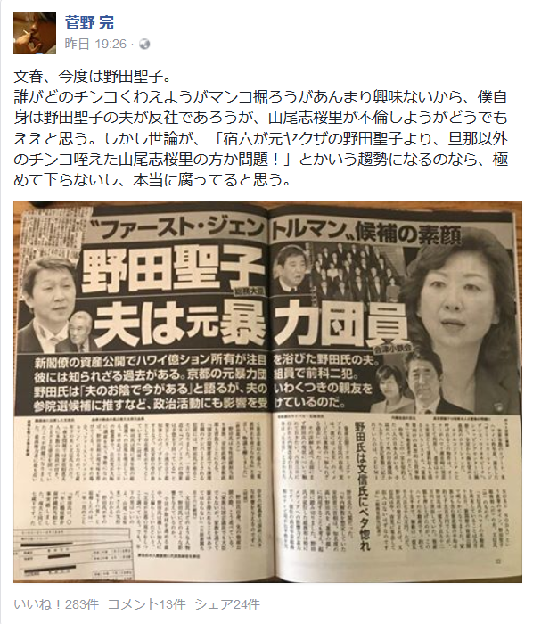 誰がどのチ〇コくわえようがマ〇コ掘ろうがあんまり興味ないから、僕自身は野田聖子の夫が反社であろうが、山尾志桜里が不倫しようがどうでもええと思う。しかし世論が、「宿六が元ヤクザの野田聖子より、旦那以外のチ〇コ咥えた山尾志桜里の方か問題!」とかいう趨勢になるのなら、極めて下らないし、本当に腐ってると思う。