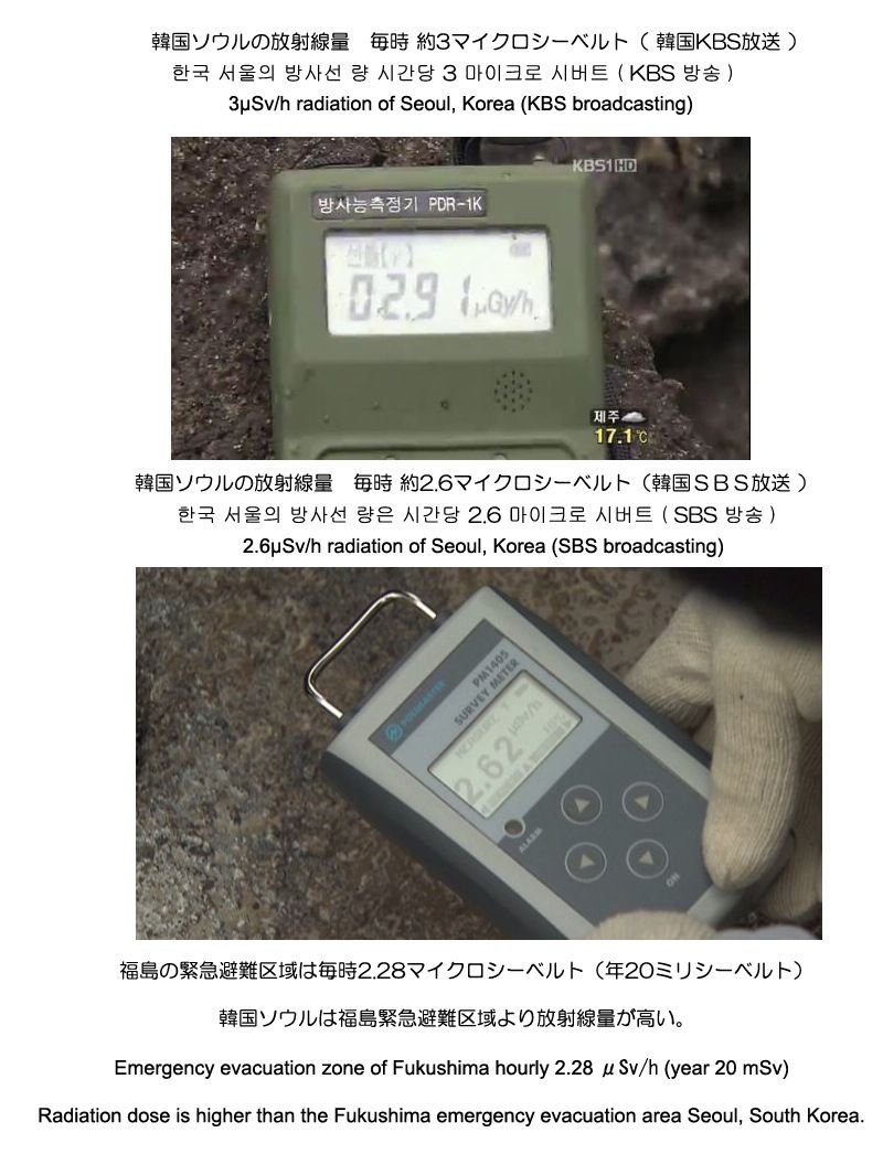 ・韓国ソウルは毎時3マイクロシーベルト、東京(毎時0.034~0.052マイクロシーベルト)の60倍