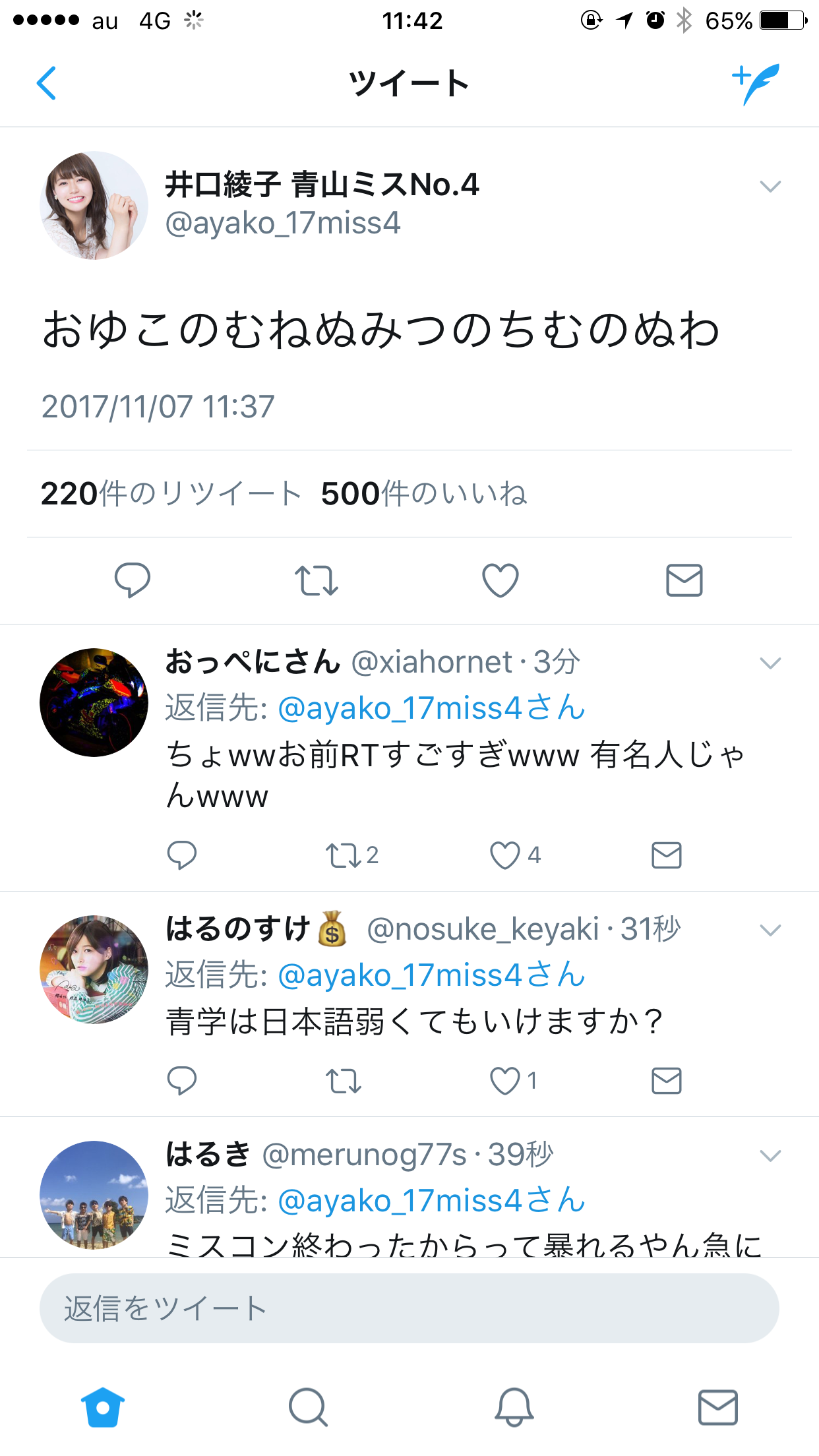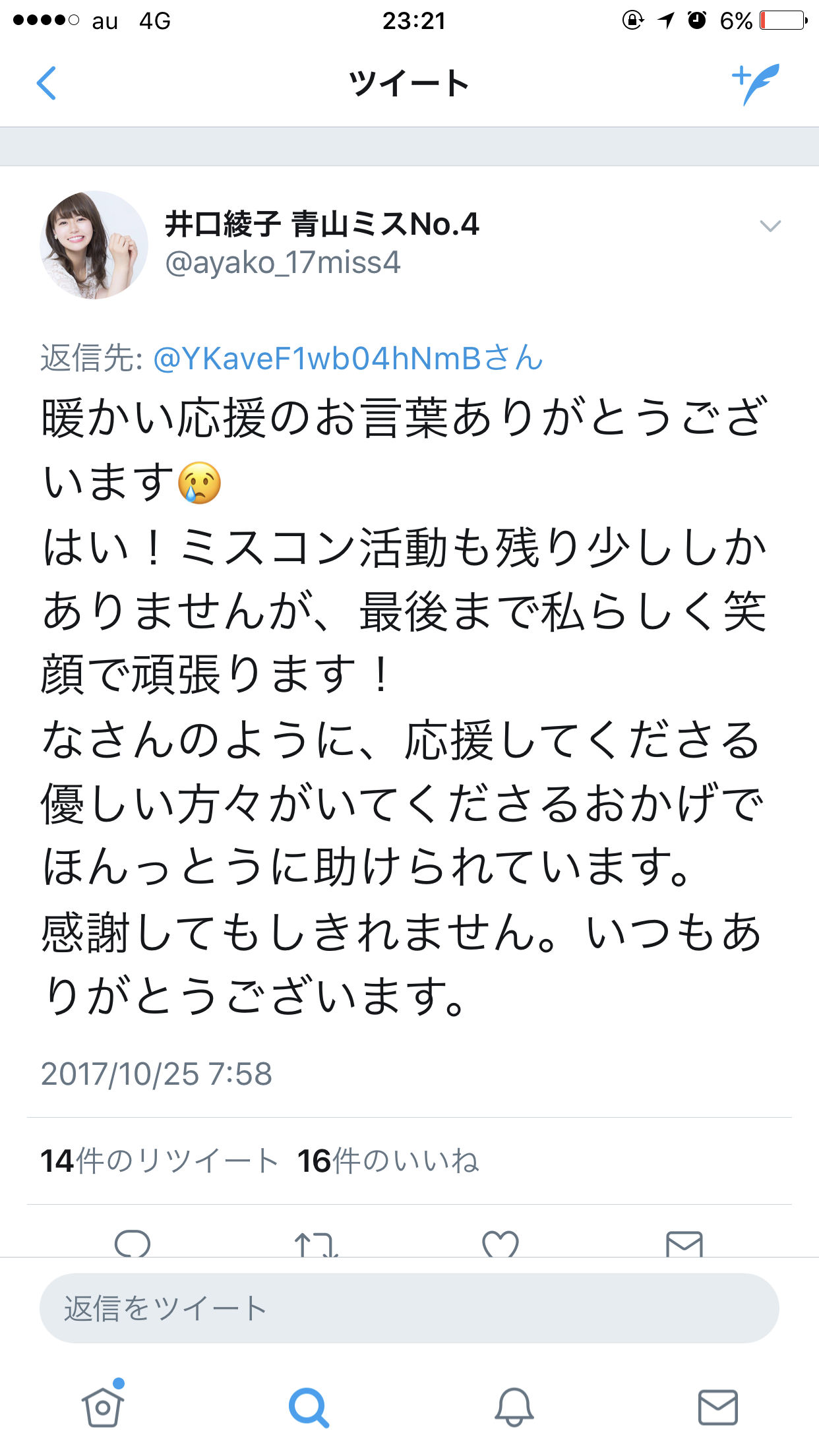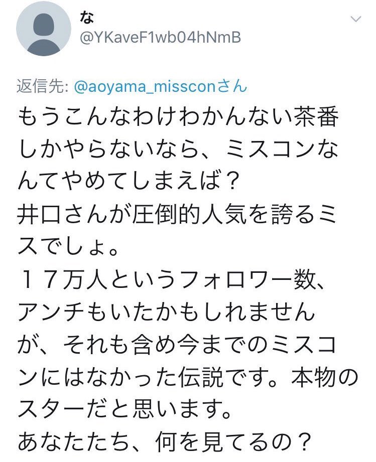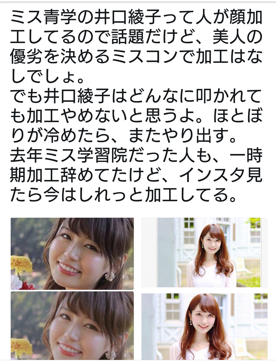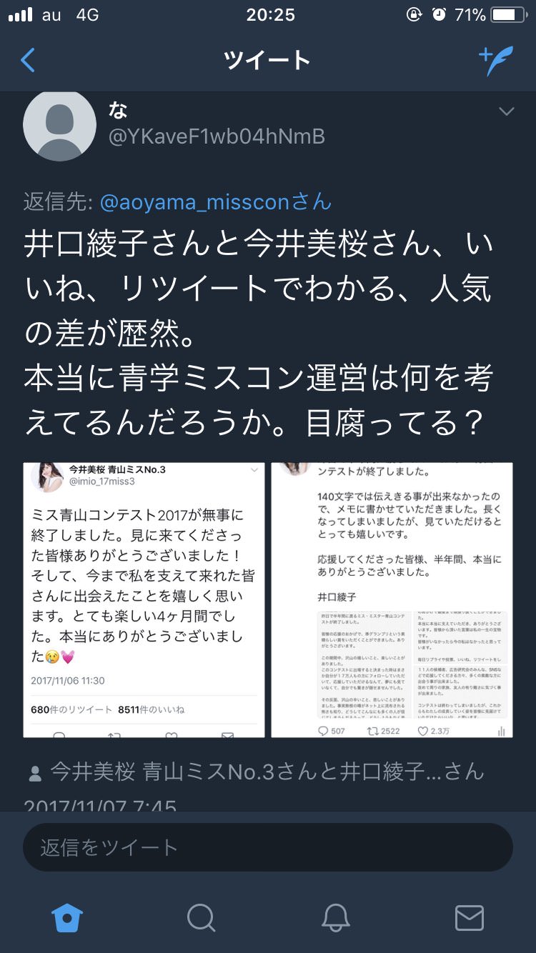 「井口綾子さんとAさん(編注:原文ではフルネーム。グランプリ受賞者)、いいね、リツイートでわかる、人気の差が歴然。本当に青学ミスコン運営は何を考えてるんだろうか、目腐ってる?」
