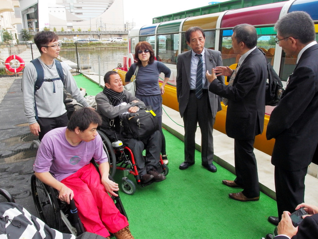 10月7日、名古屋駅南の「ささしまライブ24地区」で、車いす利用者らが市の担当者を取り囲んだ。この日、水上バス運航開始の記念式典があり、車いすのままでは乗れない船の導入に抗議した。