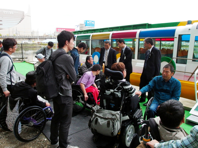 式典では車いす利用者の斎藤亮人(まこと)・名古屋市議が乗船を試みた。船着き場と船には大きな段差がある。そこにスロープを掛け、2、3人がかりで斎藤市議が乗った車いすを押し上げた。