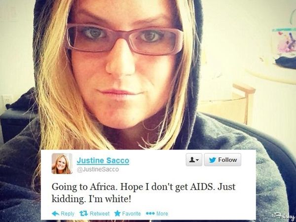 米インターネット企業「IAC(InterActive Corp)」の広報部長だったジャスティン・サッコ(Justine Sacco)氏は、南アフリカへ向かう飛行機に乗る直前、ツイッターに「これからアフリカに行きます。エイズにかからないといいな。というのは冗談よ。私は白人だもの!」と投稿した。