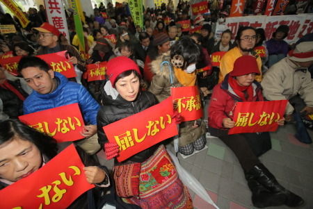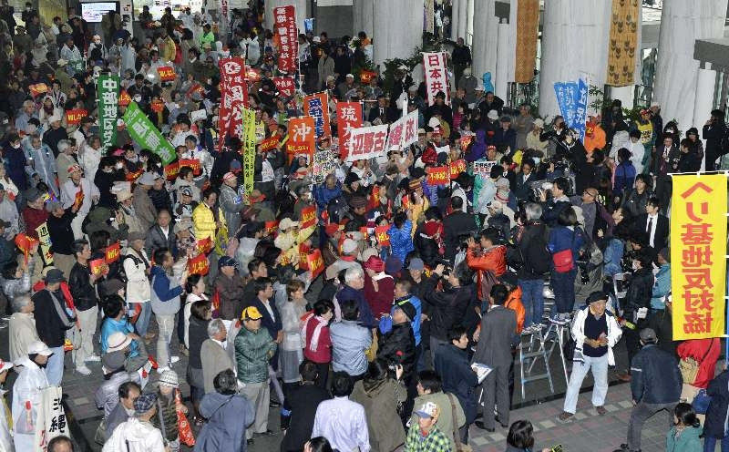 沖縄県宜野湾市の普天間飛行場の移設に向け、名護市辺野古沿岸部の埋め立てを承認した仲井真弘多知事に抗議する市民約千人が27日、県庁になだれ込んだ。