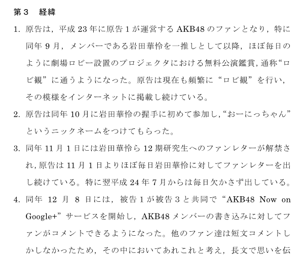 1/21に本人訴訟として提訴してきました。いろいろ事実を挙げていますが,要は,AKSは,仲良くなりすぎたメンバーとファンを,メンバーに対して辛く当たらせるという強要を行い,ファンに対して”推し変”させるという,極めて悪質なビジネスモデルであることを,この裁判で立証したいと考えています。
