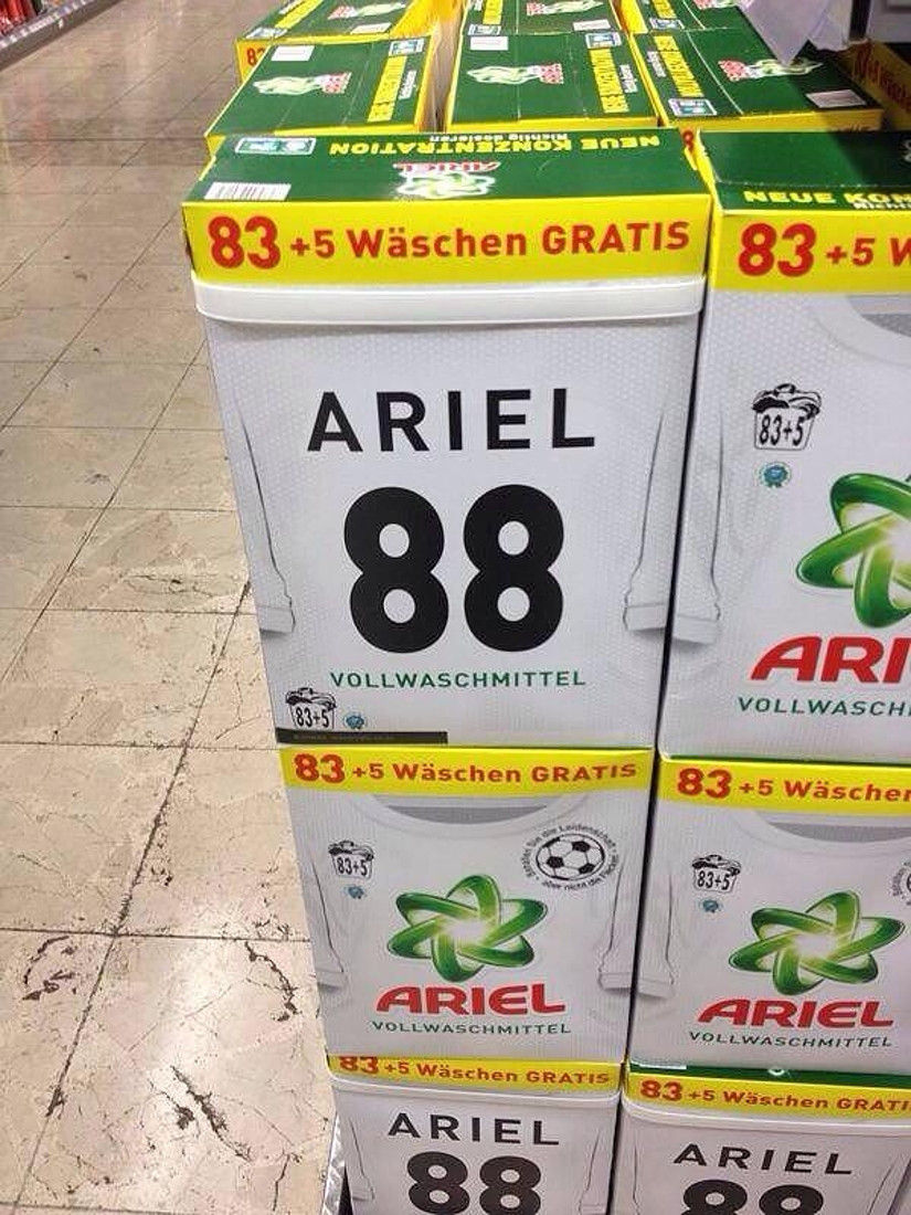 容器はサッカーのドイツ代表のユニホームを模し、背番号として「88」がデザインされていた。通常より五回多い八十八回分の洗濯ができる増量サービスの宣伝だった。ところがヒトラーを崇拝するネオナチの間では「88」は「HH」を意味し「ハイル・ヒトラー(ヒトラー万歳)」の隠語。AP通信によると、P&Gは「アドルフ・ヒトラー」を意味する「18」が容器に書かれた液体洗剤も出荷を停止したという。