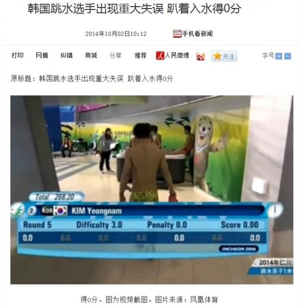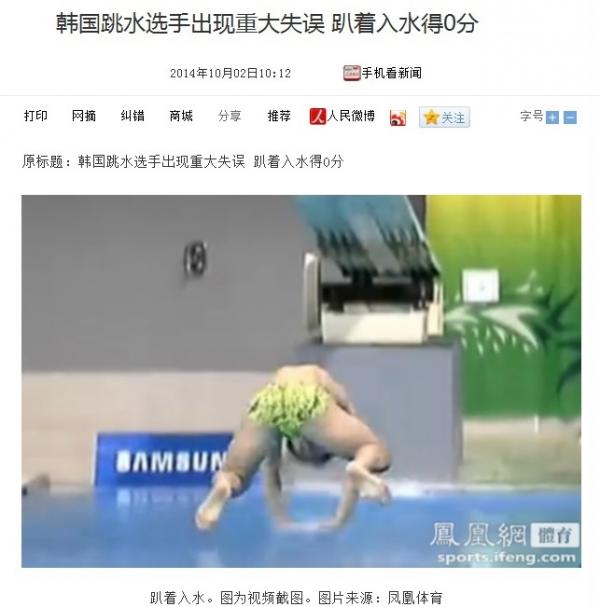 仁川アジア大会で1日、男子1メートル板飛び込みの試合が行われ、韓国選手がカエルのように不格好な着水をするミスで0点という記録を出した。中国・鳳凰体育が2日、中国版ツイッター・微博で伝えた。