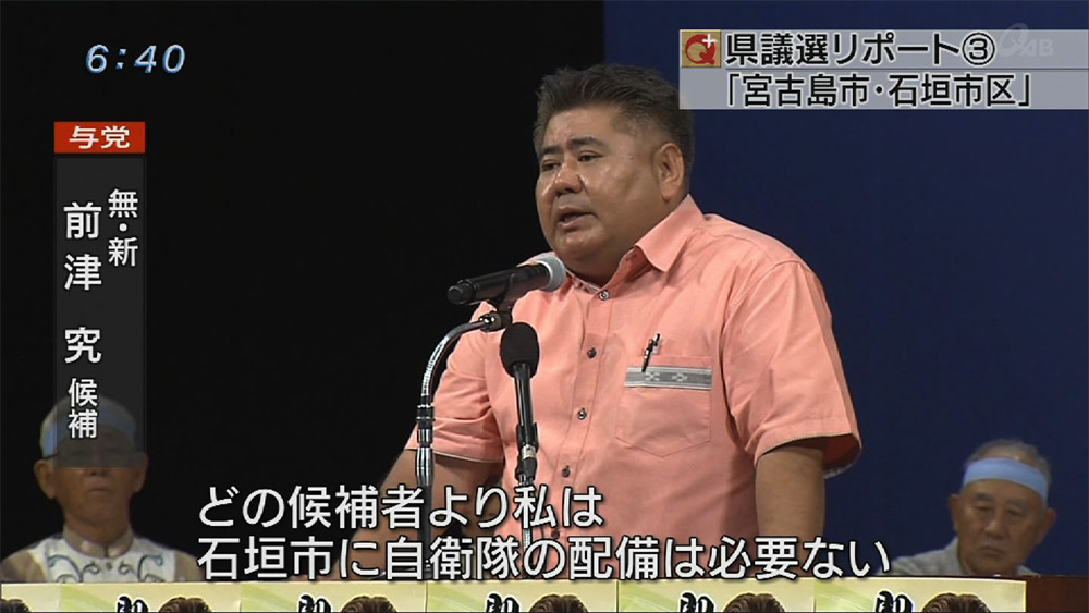 前津氏は、辺野古移設反対の活動家が石垣島への陸上自衛隊配備に抗議するため来島したことに対し、市長が「市民が混乱する」と発言した地元紙のインタビューを取り上げ「混乱の原因をつくったのはあなただ」と追及。