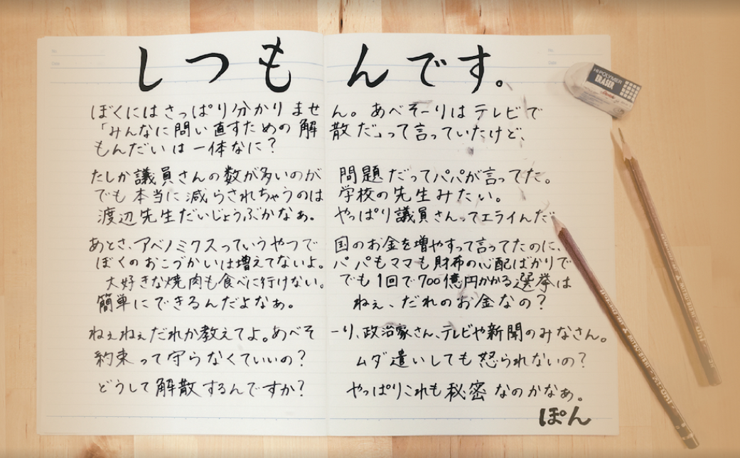 案の定の出来事だった。解散を恨むような人物・団体といえば、民主党しか思い浮かばない。小学4年生のふりをするとは、呆れた宣伝方法である。
