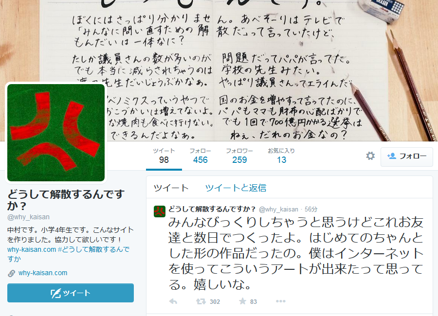 プロフィールの欄には「中村です。小学4年生です」とあくまで小学生であることをアピール。TwitterのIDは「why_kaisan」で解散に対する強い不満が窺える。