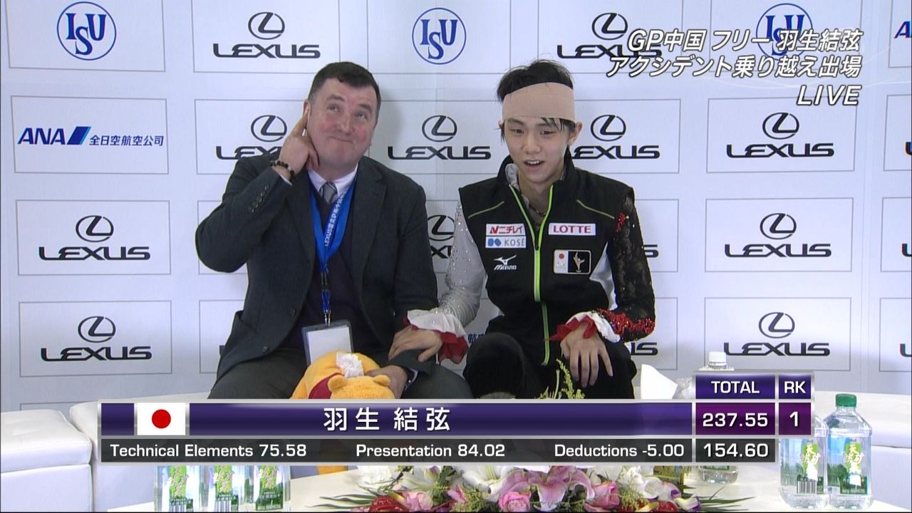 羽生選手は、中国杯のフリー直前の練習で、中国選手と衝突して頭やあごなどにけがを負った。手当てを受けた後、フリーに出場し、5度転倒したが、最後まで滑りきり2位となった。9日に帰国して精密検査を受けた結果、全治2~3週間と診断され、NHK杯の出場が危ぶまれていた。